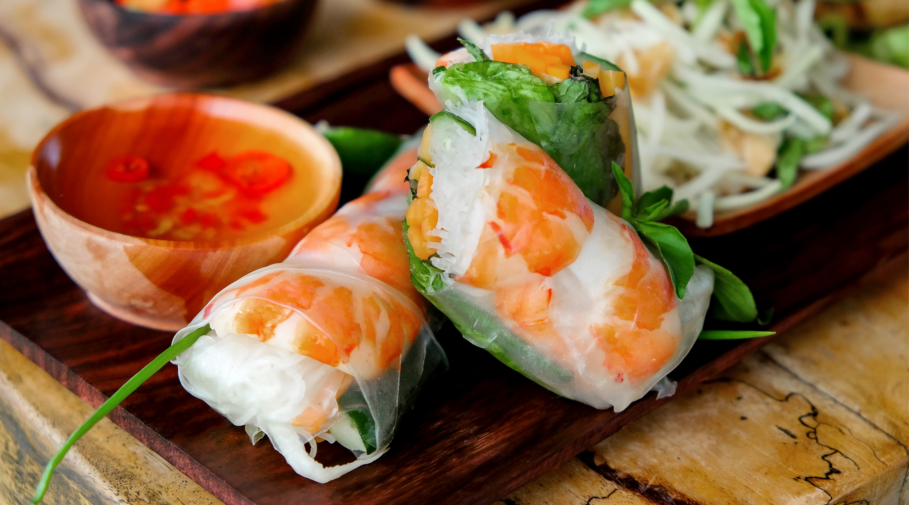 In a row across the center, place 2 shrimp halves, a handful of vermicelli, basil, mint, cilantro and lettuce, leaving about 2 inches uncovered on each side.